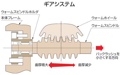 傳動機構為雙導程蝸桿蝸輪,此機構優點為高強度、高傳動效率、嚙合面積大,其分散接觸壓力耐久性高,且背隙可透過推向小齒厚方向作調整。