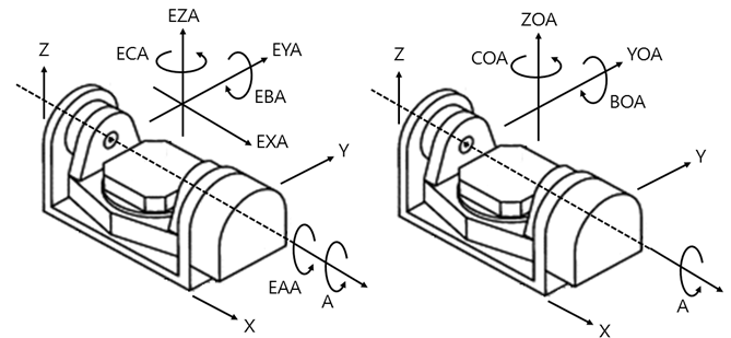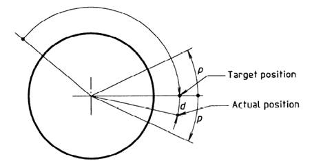 本文所量測誤差為傾斜軸誤差中之EAA項目,係指旋轉工作台繞傾斜軸線旋轉某一點在運動後所到達之位置偏離其目標位置之許可差,其所產生偏差值d為實際位置與目標位置間之距離,旋轉角度相對於連結其上角位移定位公差為p;所量測到之誤差值ISO標準中定義為EAA,包含因角度偏差下所引起旋轉誤差(EBA、ECA),及因直度偏差量所引起之徑軸向偏差(EXA、EYA、EZA),為一傾斜軸運動中因各種幾何及運動誤差所影響下最後產生之路徑表示方法。