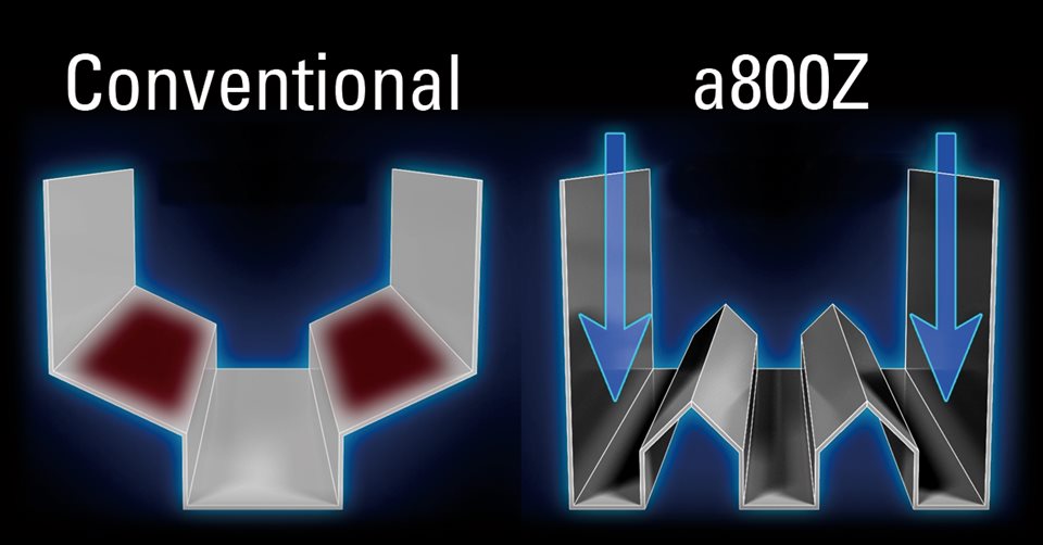 MAKINO在此次新發表的a800Z中強調了排屑的設計,外型上以直立型設計,並以三個排屑通道加快切屑進入輸送帶,材質上利用了不鏽鋼的護罩材質減少切屑沾黏。