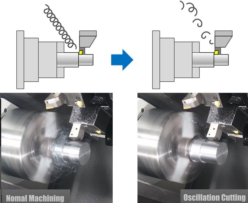 Nakamura-Tome中村留精密工業為解決在車削加工中容易產生長條切屑纏繞在工件或刀具上因而影響機台自動化,在斷屑議題上採用了震動切削,透過刀具震動將切屑分成小塊,以防止了長條切屑的纏繞,從而有效地提高排屑效率,並只需輸入G代碼就可以創建程式,且現有的機台設備可以透過升級軟體後即可使用伺服學習震動功能的NC選項,進行震動切削。