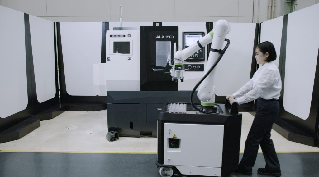 DMG MORI提出”MATRIS Light”的系統,將協作型機器搭載在手推車上,能夠以人移動至所需要的加工機旁設置,便能進行上下料的輔助作業。
