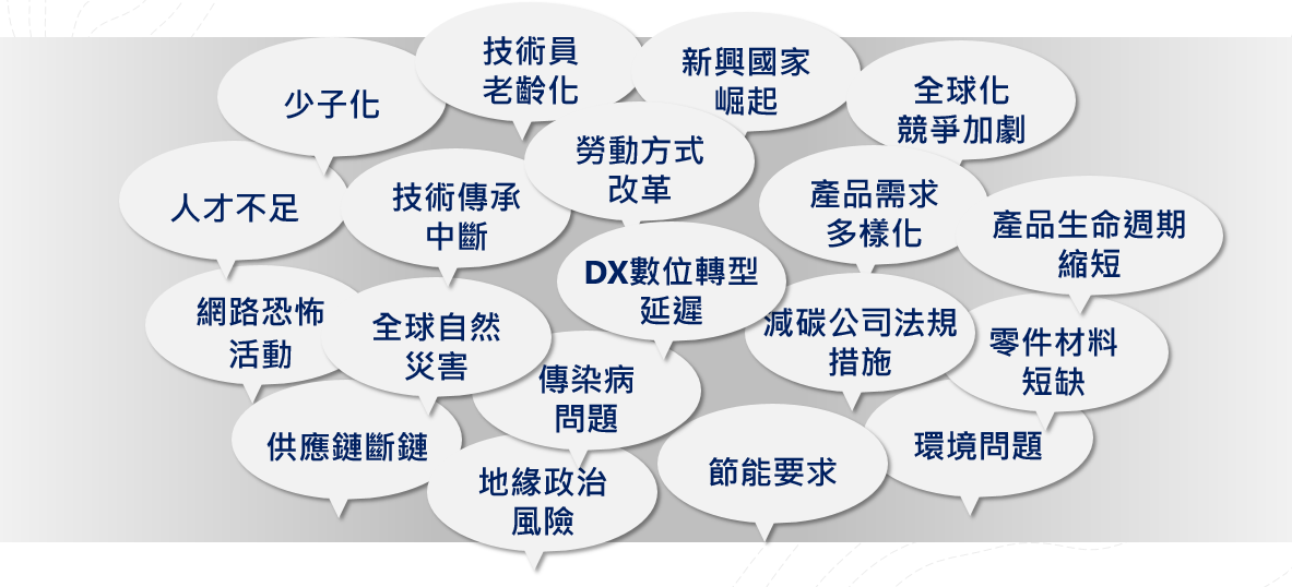 現今的社會,充斥著因勞動人口的減少、產業高齡化、技術傳承的延遲、數位化應用的需求、環境永續的社會責任等問題,各行各業都快速地發生了改變,製造業也不例外。衍伸的問題諸如:因少子化造成的作業人力不足、人員無法有足夠的時間以傳統的方式累積經驗;少量多樣的需求造成頻繁的開發新製程以及刀具、夾具的更換;因減碳造成的廠房運作成本提高等等,維持作業現場的正常運作以及獲利皆面臨著挑戰。