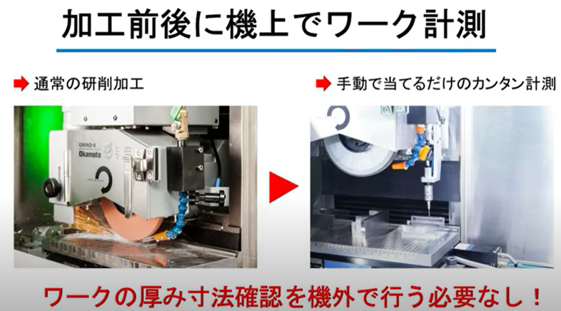 以Okamoto岡本機械為例,即使只有一個砂輪的平面磨床也進行機上量測,在砂輪旁安裝觸摸式探頭,利用Quick Touch技術透過機上量測能於平面磨床中自動執行加工後的工件尺寸量測以生成校正程式執行再加工。