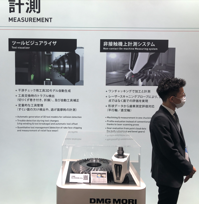 另一個案例則是在綜合加工機使用上,DMG MORI展示了以雷射感測為基礎的非接觸式量測。在工件量測應用方面,面對齒輪加工需要快速檢測齒型以及更細微的加工特徵,採用探針式的量測方法有其極限,因此以非接觸式方式替代,同樣可以整合至刀把上更換至刀庫內。在刀庫內,建置了刀具檢測裝置,可以生成3D Model以更全面精準的檢測是否有磨耗或破損等等,同時可以量化磨耗量,進行刀具壽命的管理。