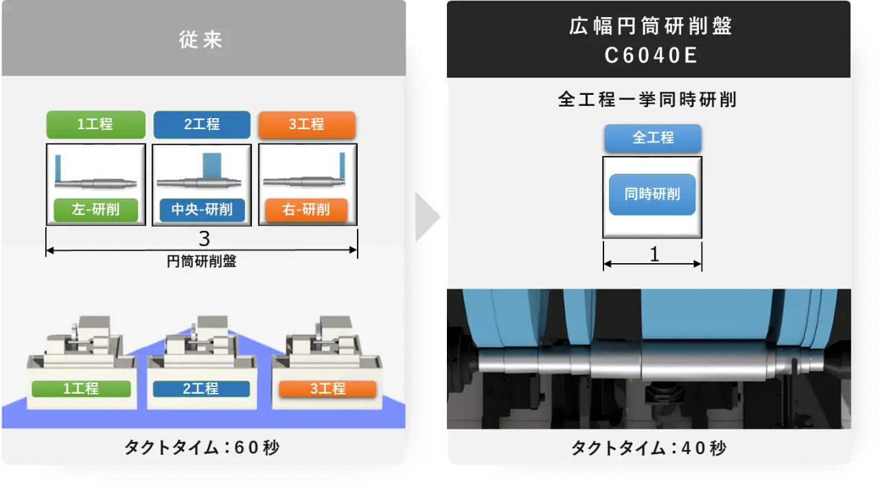 以JTEKT外圓磨床C6040E為例,整合無心磨床的雙支撐主軸與自家獨特擁有的外圓磨床的頭座,將主軸、頭座、尾座、中心架組合在一起,以節約的空間實現同時加工同一工件的不同直徑製程,從而有效率的批量生產未來市場不斷擴大的電動車馬達軸。