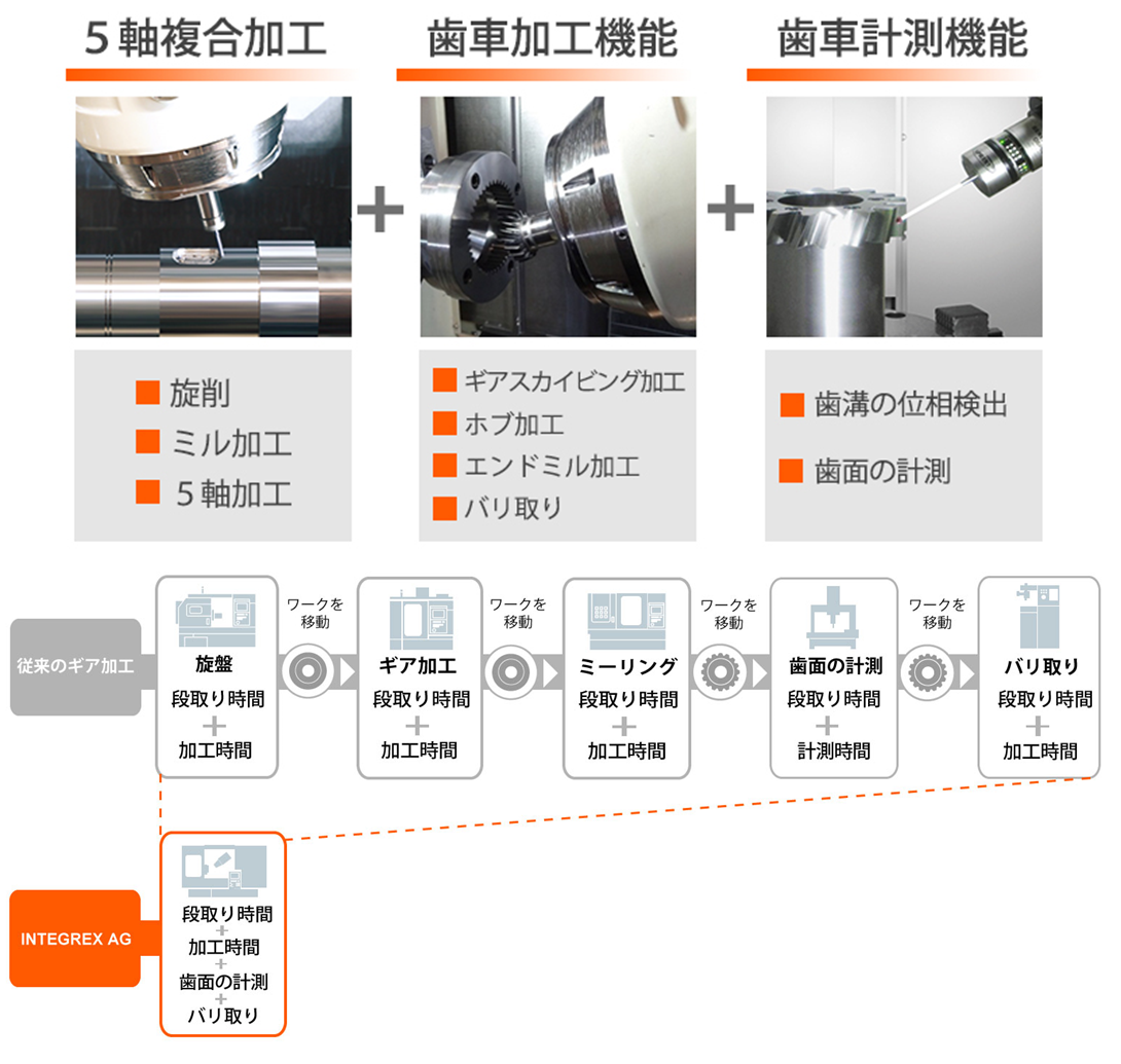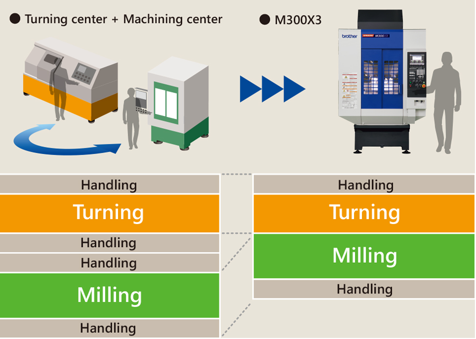 將原先需要各別單獨加工機台的製程整合到一台工具機中完成,常見機台整合車削及銑削兩種加工工藝。Brother 工業SPEEDIO系列對加工方式作了改變,發表了M200Xd1機台,搭配新開發的CNC-D00多軸控制,以及獨自開發的+120~-30度傾斜軸和DD直驅迴轉軸,可收納達28支刀的ATC高速刀具庫,並在主軸端配有兩面支撐車刀用固定夾持機構提供安定車削加工能力,在同一機台上完成車削、銑削、攻牙等多道製程,以高效率及節省空間的車銑複合機種實現工程集約。