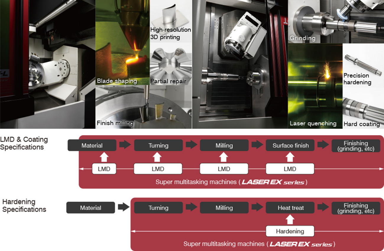 在這類新型態的加工工藝整合上,對於機台的本體並不需要太大的改變,只要考慮可加工性即可。例如FSW只要顧及工件的夾持固定、機台以及主軸的剛性是否足夠,便能在立式或臥式的工具機上實現。最具整合代表性的展示是OKUMA次世代超複合加工機LASER EX系列,結合雷射加工技術,集去除加工、增材製造、淬火、塗裝於一體的旗艦工序密集型機台,可一機完成從材料到成品的一切工序。