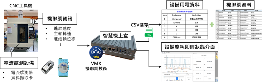 圖1所示為訊號擷取模組示意圖。該模組於目標機台及其關鍵部件上安裝電流感測器,並搭配獨立智慧機上盒作為資料蒐集與分析平台,同時整合VMX機聯網系統,能透過讀取機台控制器的即時狀態,精準判斷資料紀錄的最佳時機。資料蒐集策略採固定時間間隔方式,每0.1秒紀錄一筆能耗數據,並同步保存加工過程中機聯網資訊。每次完整加工循環會存為一個檔案,內容涵蓋34項機聯網特徵與各部件能耗資訊。此外,此模組亦整合機聯網資訊可視化功能,建立設備能耗即時狀態介面,方便現場人員即時掌握機聯網特徵及各部件能耗狀況,並作為後續能耗預測模型建立的重要依據。