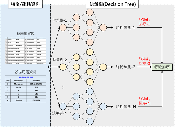 在特徵萃取階段,本研究共蒐集機台控制器機聯網34項特徵,並進一步進行特徵篩選。方法上採用隨機森林(Random Forest, RF)演算法[1],其運作流程為:先由原始資料中以「放回抽樣」方式產生多組訓練資料,再以此建構多棵決策樹;每個節點僅隨機選取部分特徵以判斷最佳分割點。完成訓練後,模型會整合所有決策樹的輸出結果,迴歸任務則取平均值作為最終預測。研究中透過RF特徵重要性分析,利用「Gini」指標篩選出與能耗高度相關的機聯網參數,作為最佳特徵排序,並進一步應用於能耗預測模型的建立。