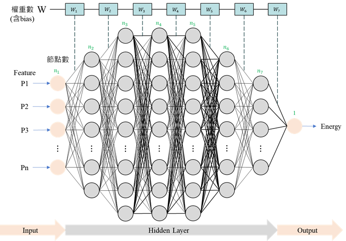 本研究採用深度類神經網路(Deep Neural Network, DNN)[2]作為能耗預測模型。DNN由多層非線性運算構成,適合處理複雜模式與高維度資料。網路架構設計包含隱藏層數量、每層神經元數,以及激活函數(如ReLU、Sigmoid)設定。訓練過程中,模型透過前向傳播計算輸出,並以損失函數衡量預測與實際值差異,再透過反向傳播計算梯度,使用優化器(如SGD或Adam)持續更新參數,以降低損失。訓練方式採批量訓練,資料切分為多個小批次,並於多個迭代中逐步學習;同時利用驗證集監控模型表現,避免過擬合,必要時採用正則化策略(如L2或Dropout)。完成訓練後,模型於測試集上評估,以確認其泛化能力。輸入端為經特徵篩選挑出的關鍵特徵,資料依比例拆分為訓練、驗證與測試集;輸出端則對應能耗與碳排預測結果。