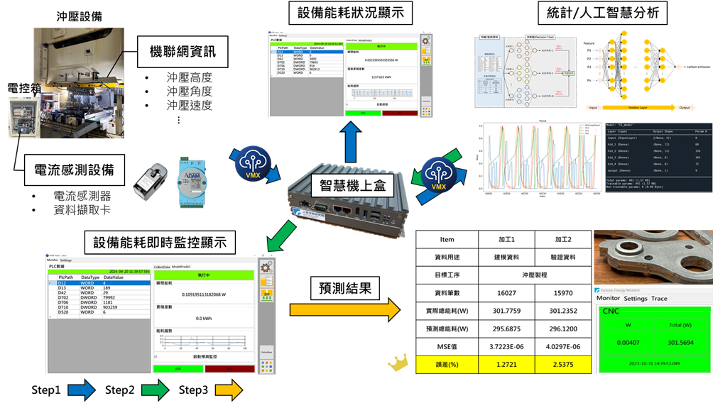 本研究具備多場域應用性,本案例以沖壓設備為對象,解決廠內缺乏能耗即時監控,導致產品碳足跡難以追蹤並不符合法規的問題。實施上,於設備總電安裝電流感測器,透過VMX機聯網技術將即時數據傳輸至智慧機上盒,並結合人工智慧建立能耗預測模型,分析加工過程能耗特徵並整合至線上監控系統,達到即時監測與預測功能。結果顯示模型在建模數據的誤差約1.27%,驗證數據誤差約2.53%,具備良好準確度。系統效益包含兩方面:一是透過即時能耗監測與參數分析,提供加工優化依據,有效降低能源浪費並提升效率與穩定性;二是能精準計算產品碳排放,為碳足跡報告提供可靠數據,協助業者符合國際永續製造要求。此技術不僅優化能源管理,更為智慧製造與永續發展奠定基礎。