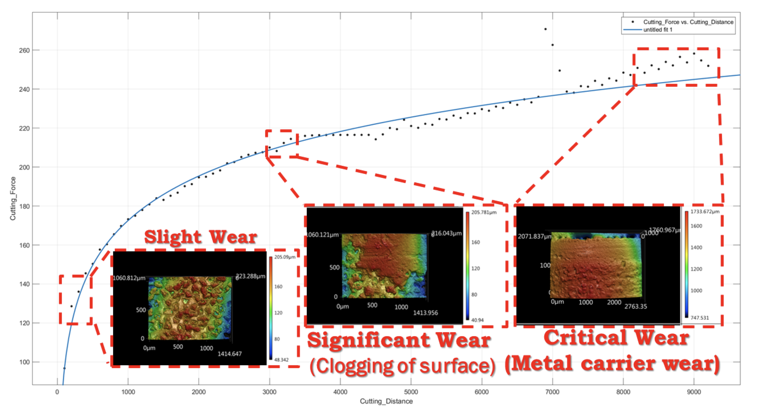 氧化鋁陶瓷加工中,透過切削力曲線可區分出鑽石磨棒的「輕微磨耗」、「顯著磨耗(表面堵塞)」及「嚴重磨耗(金屬載體磨耗)」等不同階段。這一過程證明感測刀把技術可有效辨識刀具狀態,有助於加工參數即時調整、提前預警刀具異常及提升產品良率。