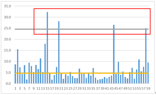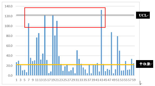 依據初始狀態定位精度檢驗數據繪製出品質管制圖(如下圖3所示),定位精度趨近於UCL管制上限上下之機械共5台。
