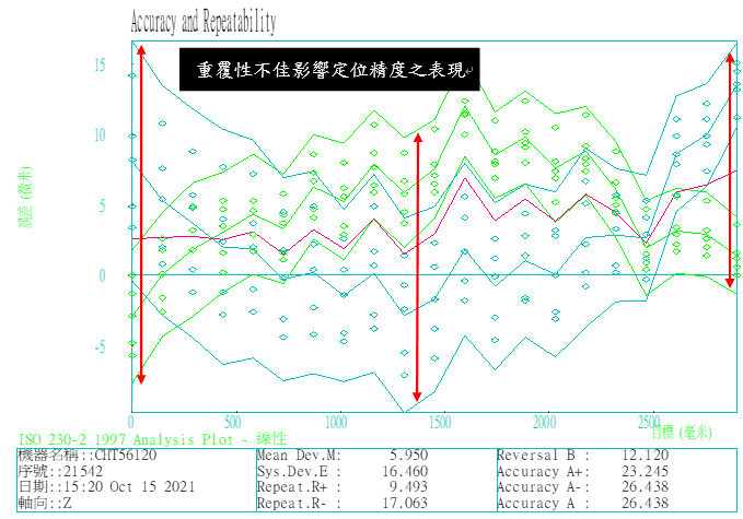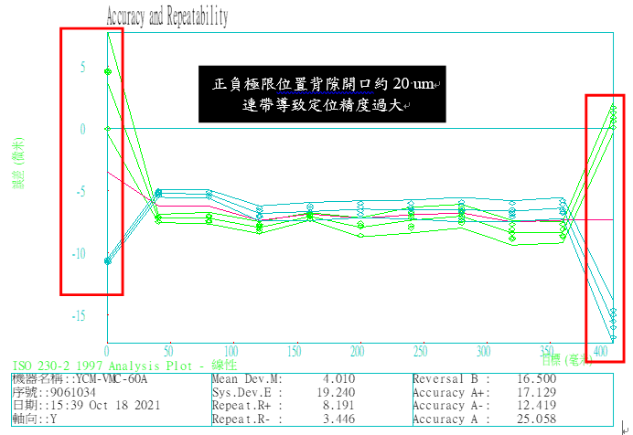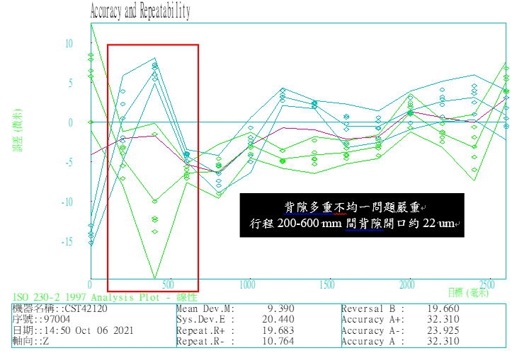 統計分析結果有5台工具機定位精度於UCL管制上限上下,進一步檢查4台定位精度誤差補償後皆有大幅度改善,仍有1台(1號機)定位精度偏大,1號機定位精度量測數據圖形如下圖4所示,根據圖形進行問題分析,發現背隙多重不均一問題嚴重,行程200-600 mm間背隙開口約22 um。