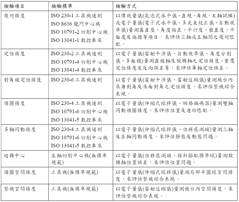 基本的工具機精度檢驗項目有幾何精度、定位精度、對角線定位精度、循圓精度及多軸同動精度等項目皆有對應的ISO國際標準規範,特殊的精度檢驗項目有循圓空間精度、整機空間精度及迴轉中心等,通盤評價工具機及確保多軸同動加工精度。工具機精度檢驗項目說明如下表1所示。