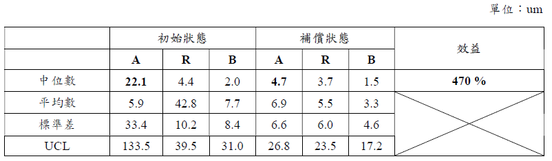 以一個國防產業年度校正案例來說明,廠內一批23台工具機包括不同品牌、不同機種、不同構型及不同行程大小等,規劃以ISO 230-2國際標準進行檢驗直線軸定位精度,針對初始狀態(來回兩趟)及補償狀態(來回五趟)下進行量測。檢驗完成後,取23台工具機共59個軸向之檢驗數據計算得出平均數、中位數及標準差,平均數為一組數據總和除以個數;中位數為一組數據從小到大排序後取中間數,標準差為一組數值自平均值分散開來的程度,此次分析樣本較為複雜且數據較為廣泛,標準差偏大即離散程度大,平均數容易被極大值或極小值所影響,故結果以中位數來進行分析品質管制圖。整理而言,補償狀態定位精度較初始狀態提升470 %(如下表2所示),年度校正結果效果顯著。該案例屬性較為複雜,綜合分析僅能觀察趨勢,待單機檢驗次數增加,提高樣本數後才可更加精準分析。