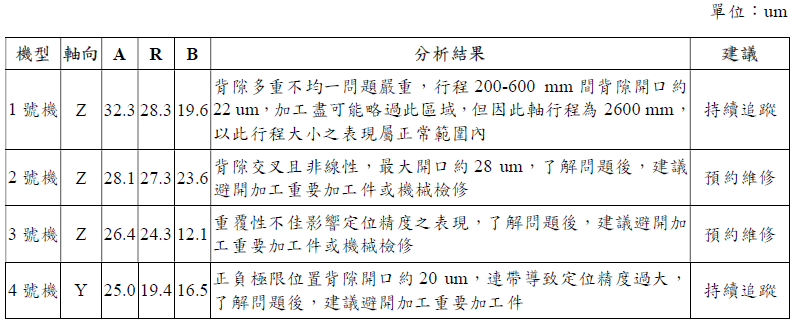 一批23台工具機共59個直線軸,規劃檢驗項目執行量測後,導入品質管制手法找出4台工具機之直線軸異常,再深入探討與分析問題給予建議,當軸向問題現階段不影響加工精度者判定執行追蹤;若難以避免影響加工精度者判定為預約維修,可讓工廠資源得到最佳化運用。工具機年度校正品質管制分析結果如下表3所示。