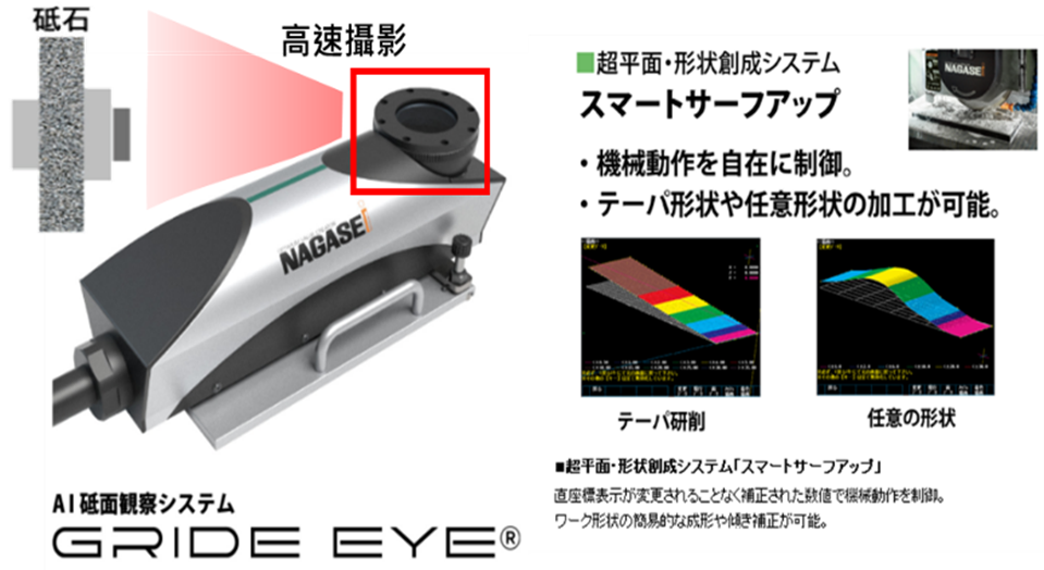 此外,NAGASE針對砂輪研磨表面開發一套AI砂輪表面觀察系統-GRIDE EYE®,透過在砂輪旋轉過程中即時高速拍攝其研磨表面,並結合AI解析,預測加工過程中可能出現的不良狀況,並建議適當的修整時機,以減少防止加工缺陷。