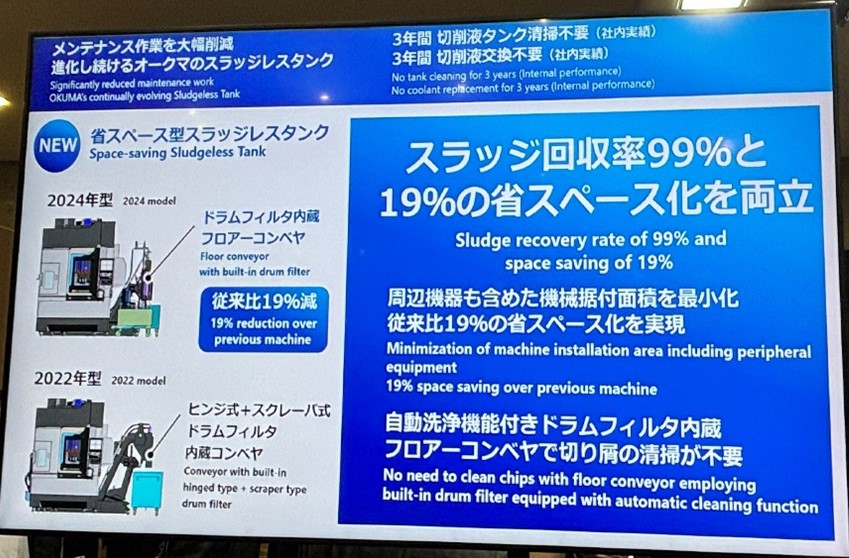 OKUMA針對切削液清潔度問題提出解決方案,其開發了一款Sludgeless Tank(無污泥槽),能有效收集高達99%的污泥,針對鑄件的污泥負荷率高達99%,鋁的部分則達到97%。此外,該設計的單向流動機制有效防止冷卻液因排放而劣化,同時顯著降低冷卻液更換的頻率。