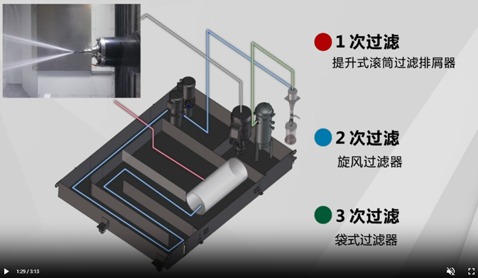 在三級過濾(滾筒-旋風-袋式過濾器)滲透之後,可大幅減少水箱內的污泥堆積,能夠顯著降低水箱清洗的頻率,確保冷卻液可長期保持穩定,且在3年內無須清洗水箱與更換冷卻液,同時汙水幫浦的數量從2個減少至1個,並最多可減少1/6電力消耗。此設計減少冷卻液的更換頻率和機構空間,對環境的衝擊也隨之降低,也實踐這項技術在環保上的多重優勢。