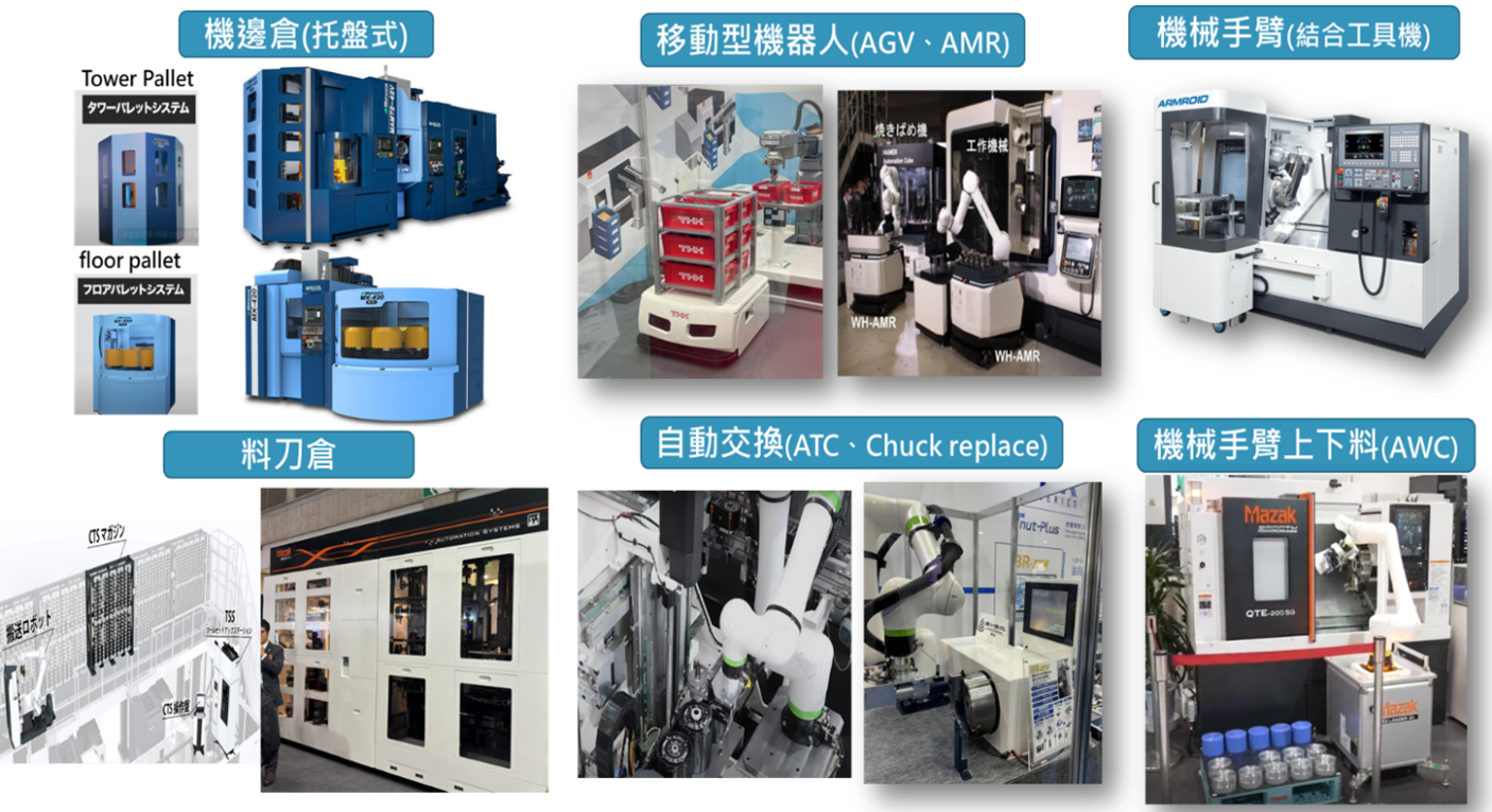 本次展會除各家工具機廠商針對不同自動化情境進行相關產品展示外,甚至連零組件周邊廠商也展示自動化技術能量,小至自動化生產單元的機台設備與自動化周邊整合(如:機械手臂自動搬運工件、自動換刀與夾治具、自動化倉儲管理等),大至整廠產線的高度自動化(如:透過移動型機器人取料/搬料、切屑運送、自動換線加工等),以提供客戶提升生產力與效率的解決方案。