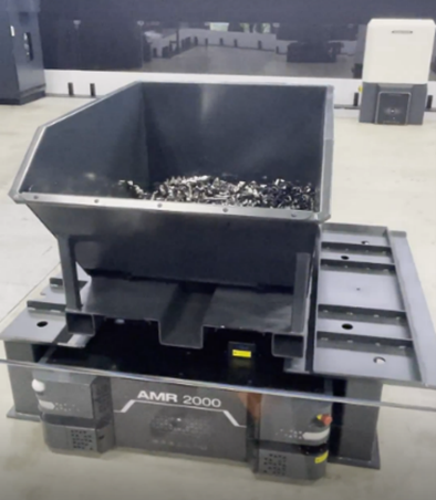 DMG MORI於此次展覽上也展示了主動式移動型機器人AMR2000,結合INH 63(臥式5軸加工中心機)機台展示自動搬運切削鐵屑桶之生產情境,搭配超音波感測器,可以即時偵測切屑蒐集的狀態,並透過AMR2000自動生成搬運路徑,能更有效的進行鐵屑桶更換,維持長時間自動化加工。
