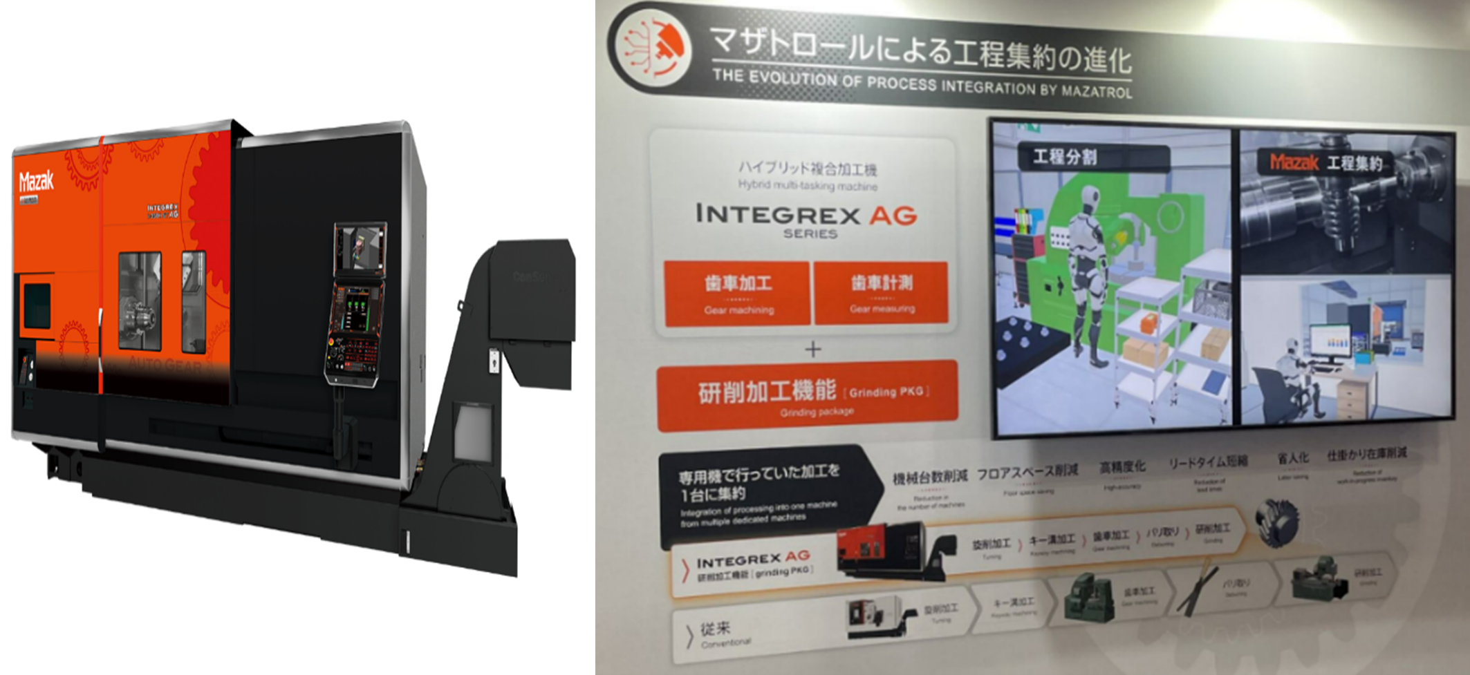 傳統機械加工工法,單一產品需經過車削、銑削、鑽孔、滾齒、去毛邊、清潔切屑、精加工、研磨等不同的加工工法。現在透過工程集約可將這些製程整併於單一機台上。除此之外,工件精度量測、外觀檢查、生產過程中在不同機器上執行的多道工序,亦可合併為一道工序。此次可看出指標大廠(如:OKUMA、Mazak等)提出不同工程集約方式,包含車+銑+齒(Skiving)、車+銑+磨(Grinding)、車+銑+積層製造 (Addictive Manufacturing;AM),藉由不同工序之整合,達到減少機台數量及機台佔用空間,進而提高加工效率與工廠空間使用效率。