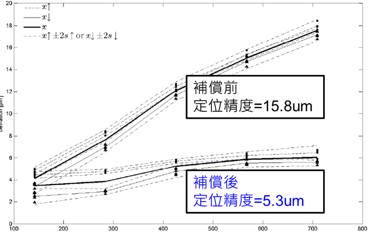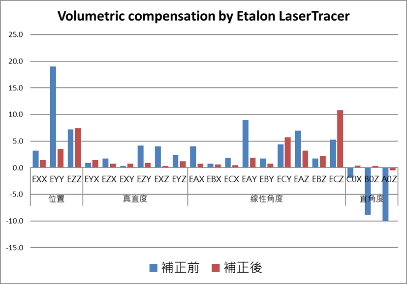 量測完比較原始及補償後21項幾何誤差數據,可得知經補償後誤差大幅降低,透過統計分析可得知其改善精度達76%,以下圖表為實測數據。