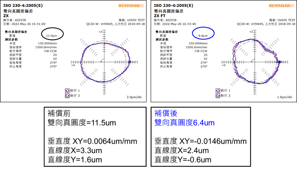 7. 循圓DBB驗證,在XY平面的測試中,未補償前的真圓度誤差為3.7微米(μm),經誤差補償後,顯著降低至2.6微米,改善幅度約30%。在YZ垂直平面的量測中,補償前的真圓度誤差為6.8um,補償後下降至4.9 um。XZ平面,補償前的真圓度誤差為11.5 um,為三個平面中最大,顯示原始在此方向的幾何偏差較為嚴重。然而經過補償後誤差顯著下降至6.4 um,改善幅度超過44%。其垂直度及直線度亦有提升。