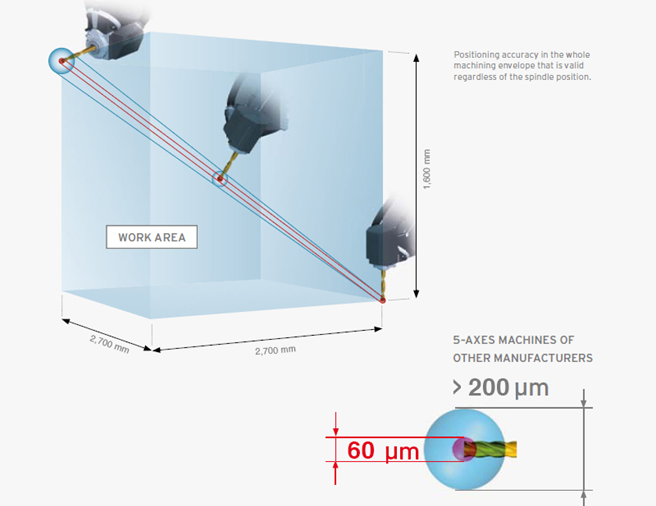 為方便理解,舉例 DMG Mori 工具機:其網站宣稱其2.7米行程之工具機,其體積誤差透過精密鏟花製程可控制60um以下。