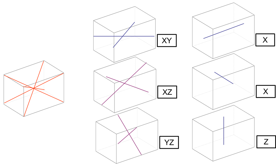 透過雷射追蹤儀模擬出對角線量測結果,床身對角→4條;床面對角→6條;中間位置→3條。共有13條對角線數據,示圖如圖18。