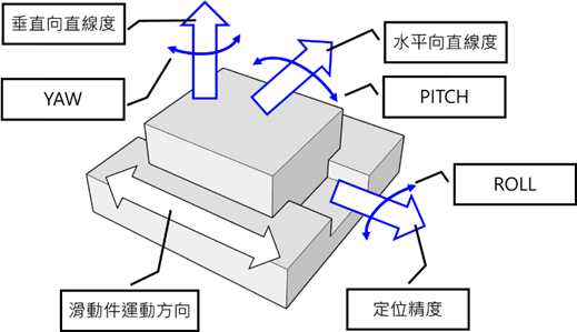 工具機的誤差可分為單軸幾何誤差、軸間垂直度誤差,其兩者合計21項,是影響精度的主要因素。三軸幾何誤差(18項),其每個線性運動軸(X/Y/Z軸)在移動時,會產生6項自由度誤差(3平移+3旋轉),三軸共18項。圖1單軸為例: