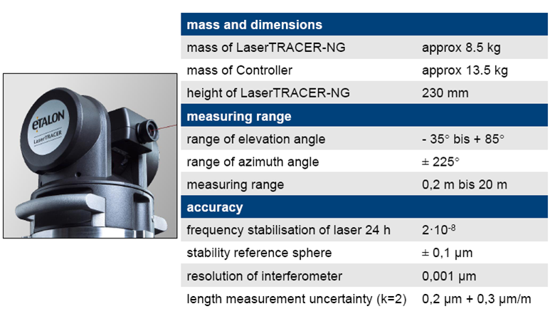 雷射追蹤儀其量測長度可達20m,且由於本體具有相當的體積與重量(230mm;8.5kg),故較適合中、大型工具機量測。其解析度可到0.001um,故除了適合量測與補償工具機,其相關技術亦也用在CMM領域。圖7為規格表: