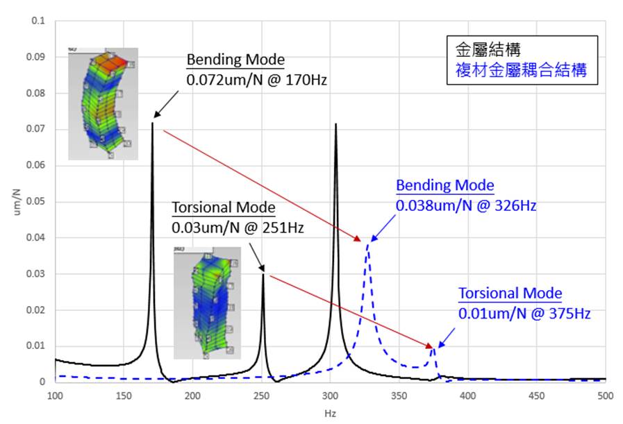本文在新興材料導入應用中也進一步結合金屬骨架與碳纖維複材,進行頭座異質結構設計,搭配CAE模擬分析,在剛性指標達標下實現20%的重量減輕,第一組彎曲模態自然頻率提升91%(由170Hz提升至326Hz),阻尼比更可提升3倍(0.165% à 0.513%),證明其優異的機械性質,並藉由模組化設計導入產線,證明結構輕量化不僅可有效節能、提升動態響應與控制精度,更具備可規模化推廣潛力,為下一代智慧工具機奠定高效節能之基礎。