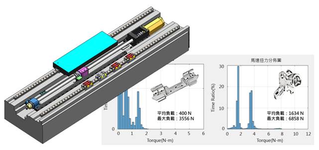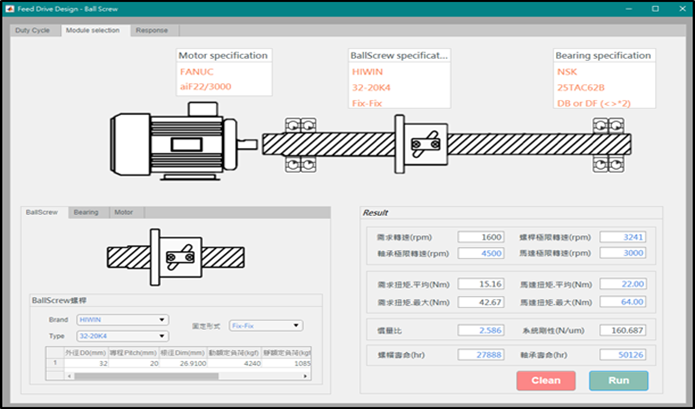 設計傳動系統的第一步,是根據實際加工任務定義工作週期條件(Duty Cycle),包含負載力與轉速資料,這些數據可來自理論模型計算,亦可透過加工歷程信號進行實測分析,擷取最大負載、平均負載與對應轉速等關鍵指標,作為螺桿與馬達選型依據。關鍵設計參數包括螺桿的危險轉速、軸向剛性、挫曲負荷與螺帽壽命,皆須進行精密計算[1],以確保整體系統穩定可靠;在馬達選型方面,則需根據所需進給速度與螺桿導程推算馬達轉速,並考量加減速時的瞬時最大扭矩與負載慣量,同時確保馬達慣量與系統慣量比值維持在1:3的建議參考以內,以避免控制不穩與振動問題,若慣量比過高,可考慮引入減速機以有效降低負載對馬達的動態影響。