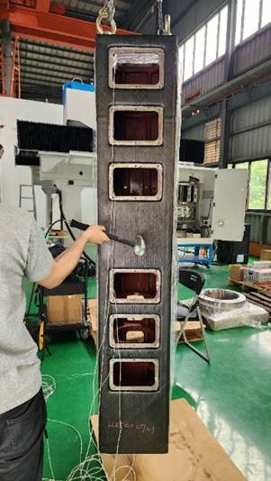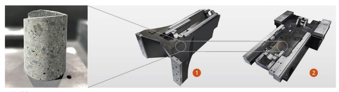 在新興材料導入方面,複合材料(如碳纖維、礦物鑄件)因具高比強度、高阻尼性、熱穩定性與低製造能耗…等優勢,成為工具機輕量化的關鍵突破。在國際工具機結構材料的應用趨勢上,碳纖維複材與礦物鑄件正成為兩大輕量化與高穩定性設計的重要方向,其中在2023年德國EMO展中,FOOKE公司發表搭載碳纖維主軸頭座的 ENDURA® 700LINEAR,透過複材實現25%以上的質量減重,並嵌入感測器進行健康監控,成功提升定位精度與熱穩定性[2];2025年北京展中,上海拓璞數控也同步推出全複合材料結構的龍門加工機,採用大面積碳纖結構來降低移動慣量並有效強化結構阻尼,提升高速加工與長時間切削的精度穩定性,成為中國高階複材應用的突破案例;另一方面,礦物鑄件也因具備高阻尼、低熱傳與穩定性佳…等特性,在高階設備應用中開始受到矚目,其中MAZAK於2024年JIMTOF展中發表的立式加工機VCN-460 HDCC即採用礦物鑄件底座設計,有效抑制振動與熱漂移,提升加工一致性;2025年北京展則可見多家中國廠商亦推出應用礦物鑄件的工具機機型,反映出礦物鑄件已逐漸成為中大型工具機結構升級的重要材料選項。整體而言,碳纖複材與礦物鑄件技術的國際應用正同步發展,各具特性,亦展現未來高性能工具機結構設計的多元路徑。