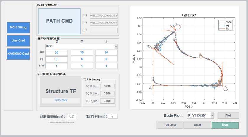 該技術透過CAE建構機械結構的等效動態響應模型(包含剛性、阻尼與質量參數),再與伺服控制迴路(位置、速度與電流控制)進行連結,模擬真實加工時伺服命令對結構運動精度的影響,設計人員可依據不同加速度、伺服增益與控制濾波器…等設定,分析機台在時域與頻域下的響應行為,進一步進行結構強化或參數優化。舉例來說當進給加速度設定過高,可能激發結構共振與動態誤差,透過模擬可提前分析性能瓶頸,避免試製失敗或反覆改版導致開發成本增加,該技術亦支援尚未實體製造的機型開發,可利用CAD模型先行建立結構響應函數,提早於設計階段介入伺服與結構的匹配優化,與2022年FANUC CNC GUIDE2所提供的伺服參數模擬功能相較[6],本文模型除可處理現有機台設備的回授訊號,也可結合CAE環境模擬開發中的設計,對於高客製機種開發更具彈性。綜合而言,整合控制與結構的數位分析不僅可大幅縮短試加工與調機時間,也可精準掌握加工品質對應之設計關鍵,成為智慧工具機設計中不可或缺的關鍵技術。
