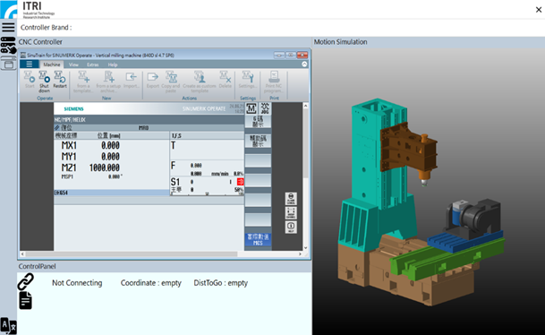 工研院虛擬工具機數位雙生平台也開發數控內核數位雙生模組,其中運動產生單元提供點對點與曲線位置/速度/加速度/急衝度(Jerk)設定,軸向伺服控制單元提供伺服進給剛體動力學模型與多種控制法則挑選(如比例-積分-微分控制、領先-落後控制、零相位追蹤誤差控制、滑動模式控制等),分析單元提供頻域響應、軸追蹤與輪廓誤差等結果,如圖3所示。目前國內工具機業者普遍採用日系FANUC或歐系SIEMENS控制器大廠行虛擬工具機數位分身系統與實體機台設備串接,因而受限於特定廠牌的數位雙生平台軟體及其受限該廠硬體工控設備,且加值研發權限取得不易。工研院開發虛擬工具機數位雙生平台中數控模擬器數位雙生模組不侷限特定廠牌控制器,可用於連結多廠牌數控模擬器與真實工具機控制器,商用控制器整合如FANUC NCGuide[4](圖1)或SIEMENS SinuTrain[5](圖4)所示。