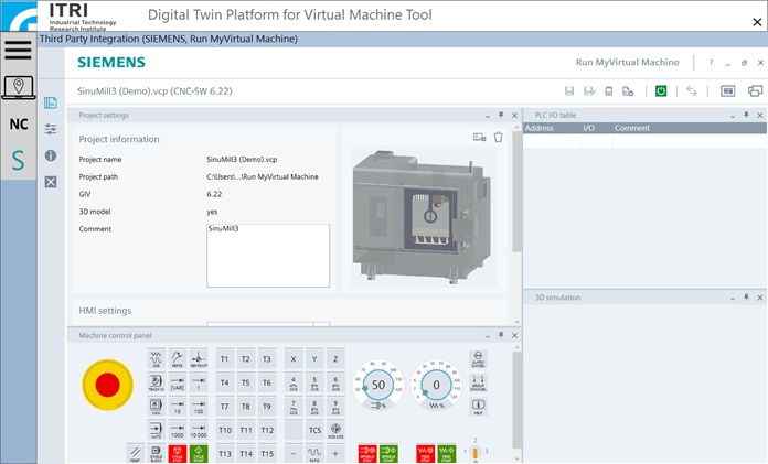 SIEMENS RMVM[7]數位雙生軟體平台內建數控模擬器Sinumerik One、3D工具機構型運動模擬、PLC I/O輸入模組等一系列功能。工研院虛擬工具機數位雙生平台整合RMVM軟體,可基於採用SIEMENS工控系統進行虛擬機台開發、虛擬加工模擬、加工時間與品質預測,日後亦可將工研院所開發數位雙生模組掛載SIEMENS Xcelerator提供雲端工具機數位雙生解決方案。