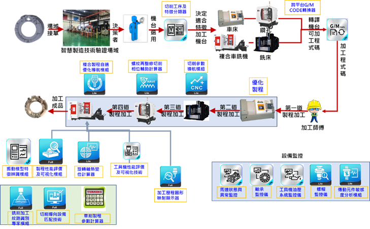 於金屬切削製程4種設備(車削中心機、鑽孔攻牙機、銑削中心機與車銑複合機)建立各自對應運動學機構鏈與零組件數位雙生模組,透過機邊電腦進行跨平台資料交換、雲端自動佈署軟體與機台控制器國際標準資料通訊聯網,並以18種SaaS軟體服務應用程式進行金屬切削設備智慧應用服務串接驗證,如圖9。