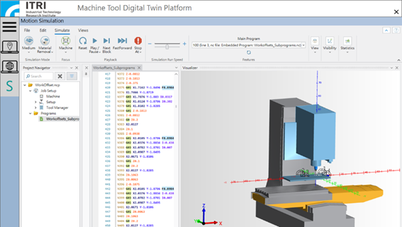 工研院虛擬工具機數位雙生平台亦整合ModuleWorks[8]3D模擬軟體,如切削模擬與機台模擬等,其中NcEditor軟體可透過輸入加工程式,並設定虛擬五軸工具機運動構型與結合控制器單節預覽進行加工模擬功能並直接讀取加工程式以進行五軸工具機構型運動模擬。