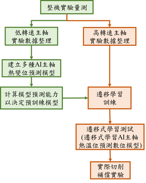 I主軸熱變位預測模組同時採用遷移式學習技術(Transfer Learning),當更換不同轉速的主軸時,可降低重新蒐集訓練資料時間,其建立方式為:(1)不同轉速實驗數據蒐集、(2)建立多種AI主軸熱變位模型(如ANN、CNN、RNN、LSTM等)以決定採用哪一種AI預訓練模型、(3)進行遷移學習的訓練及測試及(4)實際切削補償驗證,如圖6。