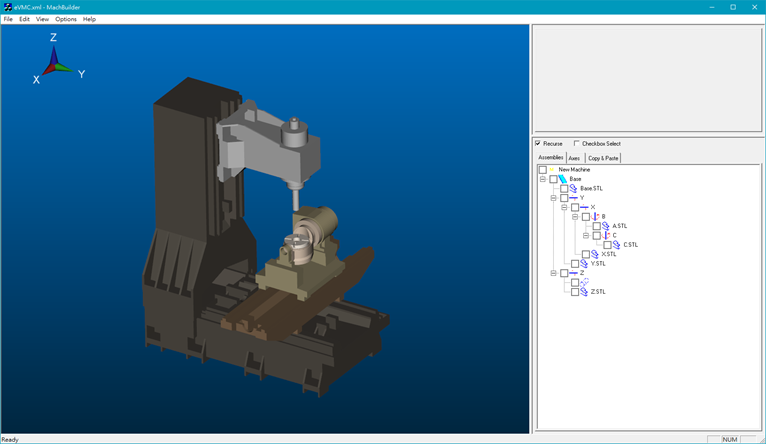 為可視化五軸加工模擬過程,可透過虛擬工具機構型數位雙生模組呈現工具機不同構型運作情形,其中3D模型由機台零件STL(STereoLithography)檔案格式建構,多軸工具機運動鏈組合件由動件組成:如立柱、主軸頭、機身(含底座)、工作臺及線軌鞍座等零組件。運動鏈建立需考量五軸工具機運動方向相互關係(如加工行程範圍、刀具方向與刀具支援類別(端銑刀、球刀)、工件位置與素材類型(方塊、圓柱)、各移動軸向原點位置、運動方式(直線或旋轉)等參數) [3],如圖2所示。