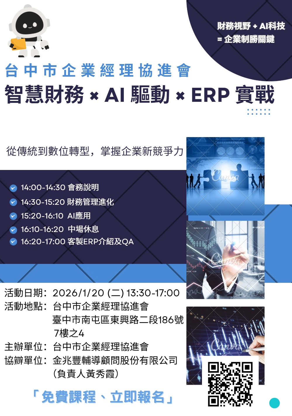 | 智慧財務 × AI 驅動 × ERP 實戰 | ~ | 台中市企業經理協進會(台中市南屯區東興路二段186號7樓之4) | 3小時 | 台中市企業經理協進會 | 金兆豐輔導顧問股份有限公司 黃秀霞 |