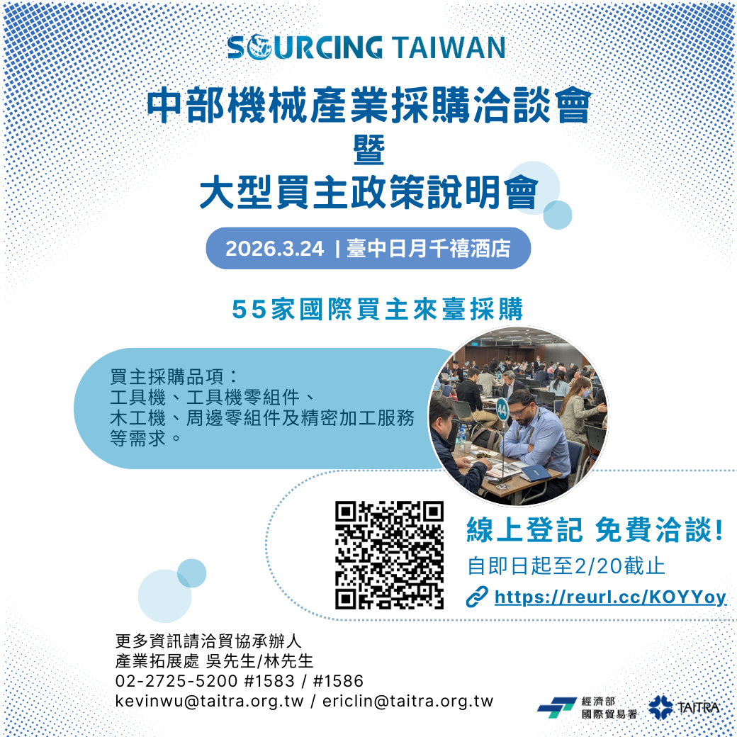 | 外貿協會-2026 TMTS 展前採購洽談會 | ~ | 台中日月千禧酒店 (B2 宴會廳) | 中華民國對外貿易發展協會 | 吳驊祐 (Kevin Wu) | 02-2725-5200 #1583 | kevinwu@taitra.org.tw 林育辰 (Eric Lin) | 02-2725-5200 #1586 | ericlin@taitra.org.tw |