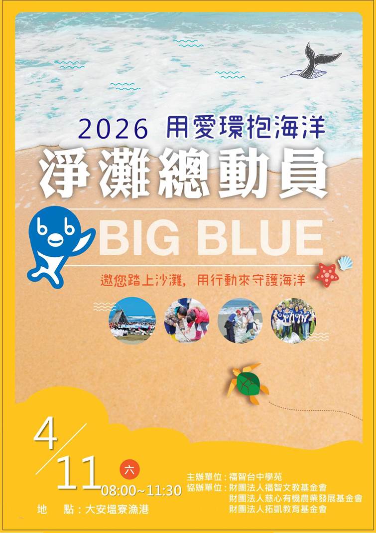 | TMBA企業志工聯盟~2026淨灘總動員4/11(六)台中大安漁港 | ~ | 臺中大安塭寮漁港(臺中市大安區海尾莊大排出口處) | 115/4/11(六)、08:00-11:30 | 台灣工具機暨零組件工業同業公會 | ericali@tmba.org.tw (TMBA 李小姐) |