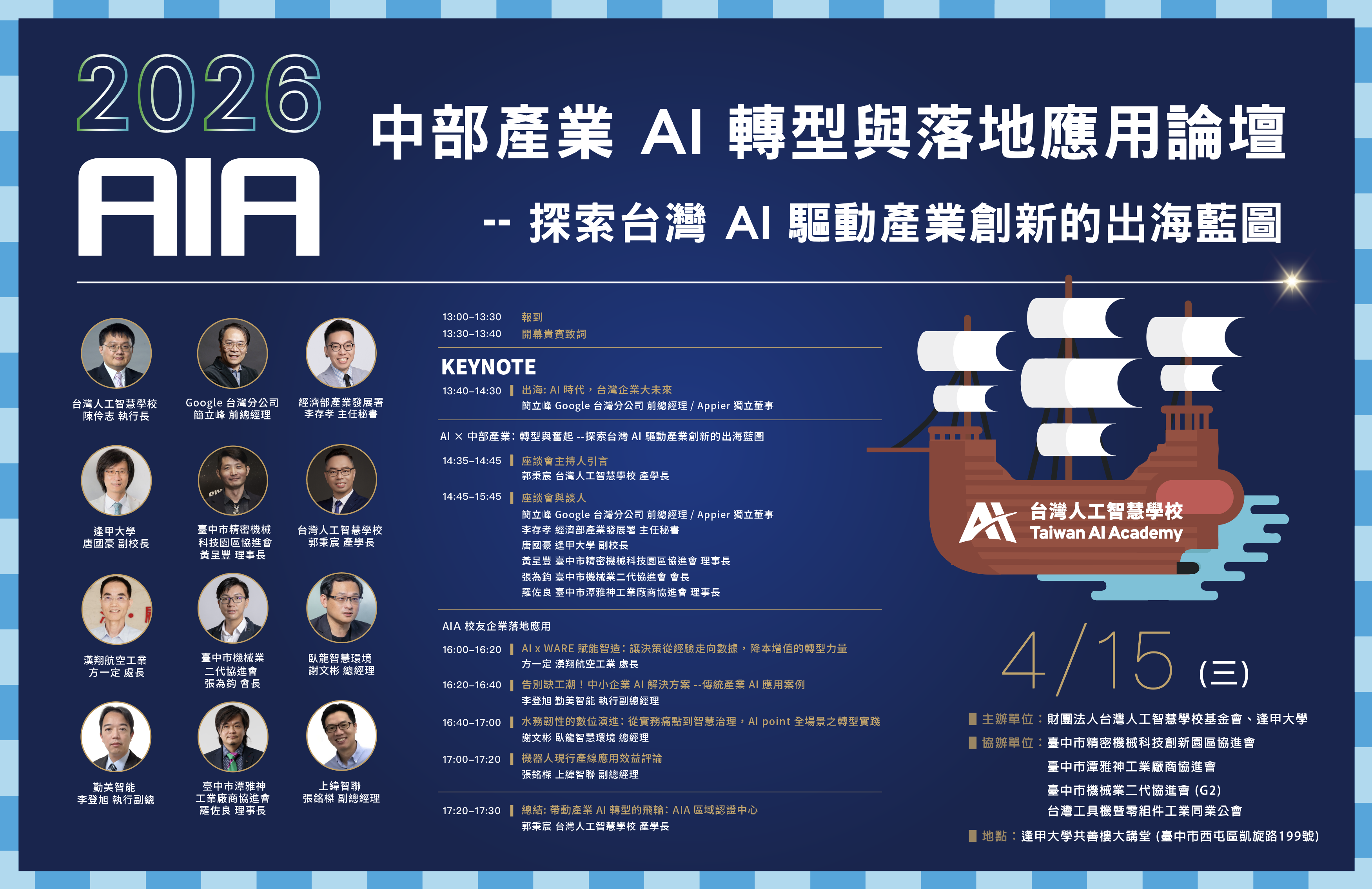 | 2026中部產業AI轉型與落地應用論壇——探索台灣AI驅動產業創新的出海藍圖 | ~ | 逢甲大學共善樓—大講堂│407037 臺中市西屯區凱旋路199號 | 2026年04月15日(三)13:30 – 17:30 | 財團法人台灣人工智慧學校基金會 |